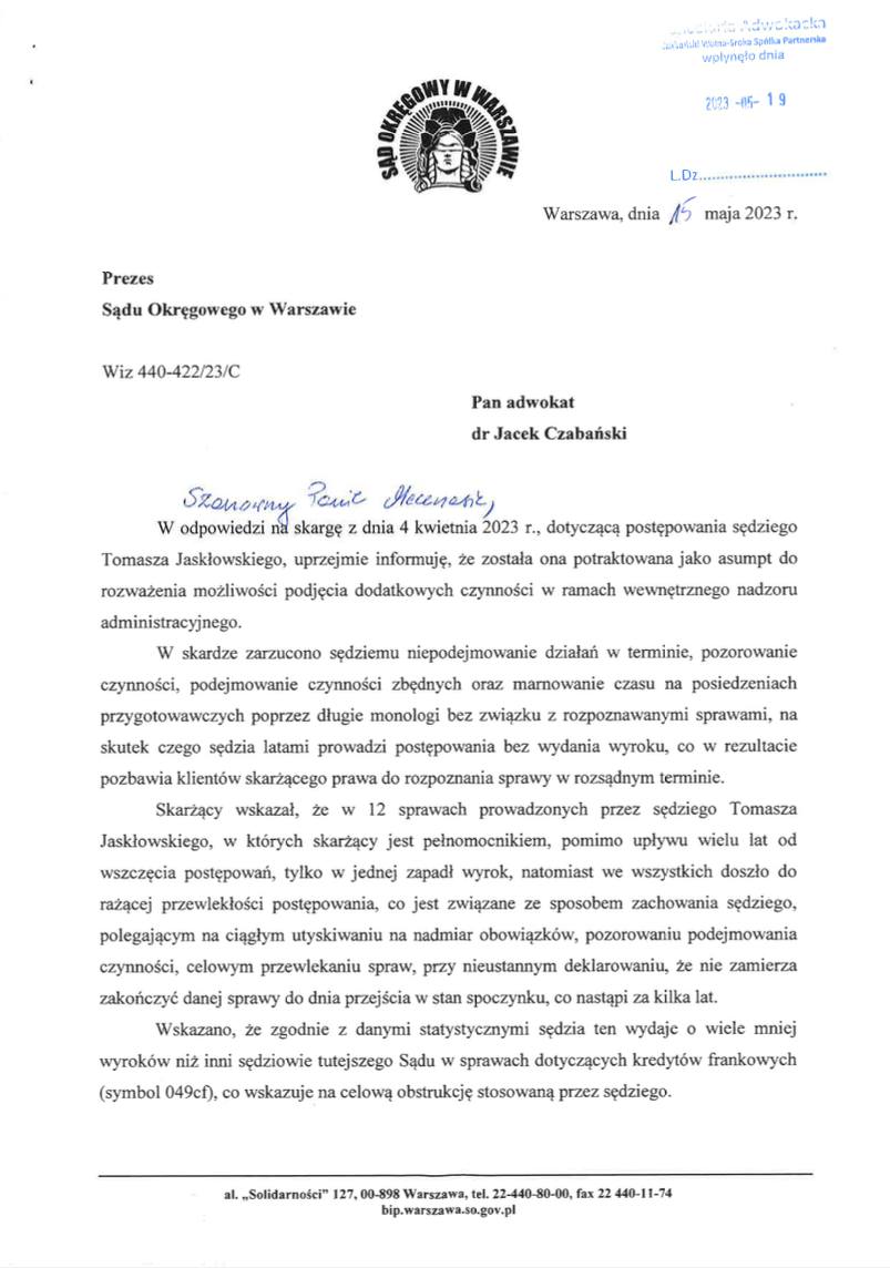 Jak zareagowała prezes SO w Warszawie na skargę Kancelarii Czabański Wolna Sroka? Odpowiedź jest już znana, gdyż prezes wystosowała ją 15 maja 2023 roku. Jak wynika z pisma, problem z przewlekłością postępowań prowadzonych przez sędziego Tomasza Jaskłowskiego jest znany, a sposób jego pracy był już wcześniej przedmiotem skarg indywidualnych i zbiorowych.