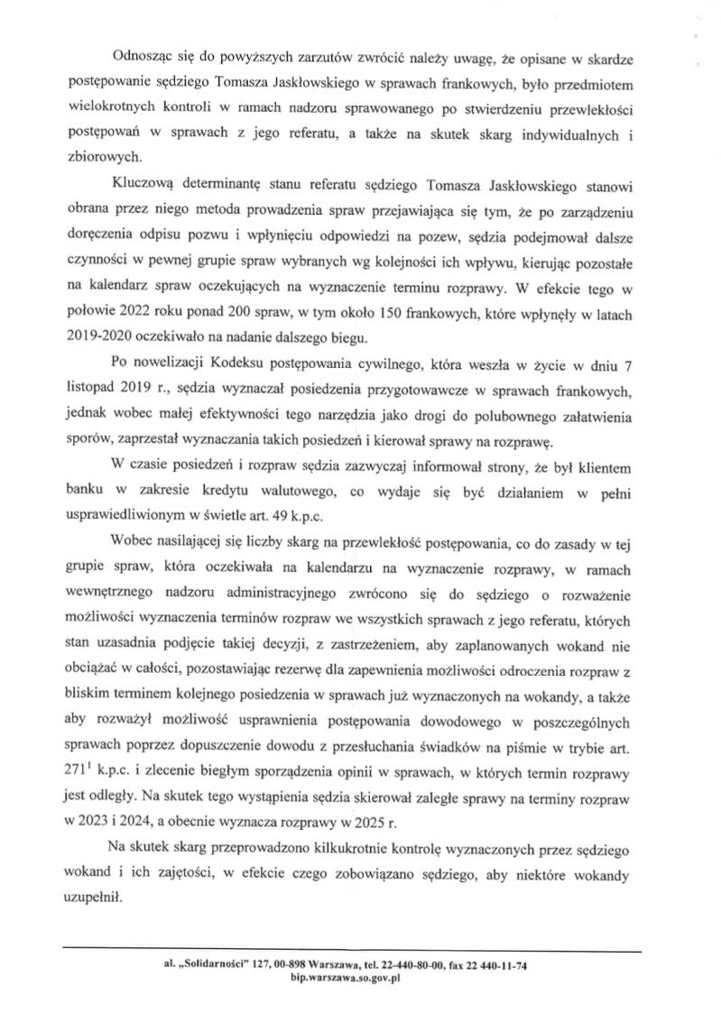 Podczas gdy inni sędziowie SO w Warszawie wydają po kilkadziesiąt orzeczeń rocznie, sędzia Tomasz Jaskłowski, bo o nim mowa w skardze kancelarii, rozpatruje 1-2 sprawy frankowe.