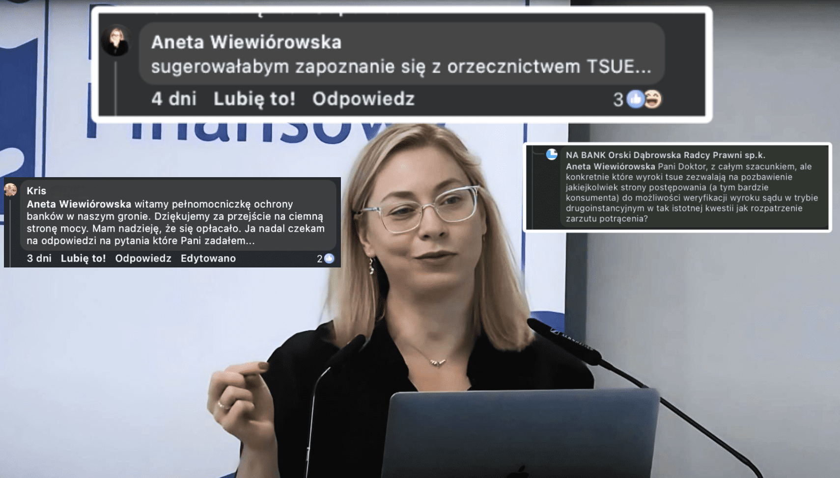 Można by oczekiwać, że pojawienie się pod takim wpisem rządowego pełnomocnika ds. ochrony praw konsumenta skutkować będzie ciekawą, merytoryczną dyskusją. Ale nic z tego. Dr Wiewiórowska-Domagalska pojawiła się pod tym postem tylko po to, by napisać „sugerowałabym zapoznanie się z orzecznictwem TSUE…”. Trzeba przyznać, że kąśliwa uwaga podziałała na społeczność frankową niczym wbicie kija w mrowisko: pod życzliwą sugestią pani pełnomocnik pojawiło się jak dotąd 31 komentarzy, pochodzących nie tylko od strony zirytowanych konsumentów, ale również od znanych prawników, próbujących wprowadzić merytoryczną wartość do rozmowy. W dyskusji udział wzięli między innymi mec. Teresa Majewska, mec. Krzysztof Orski i mec. Kacper Sampławski. Postawione przez prawników (i przez konsumentów) pytania pozostały bez odpowiedzi.