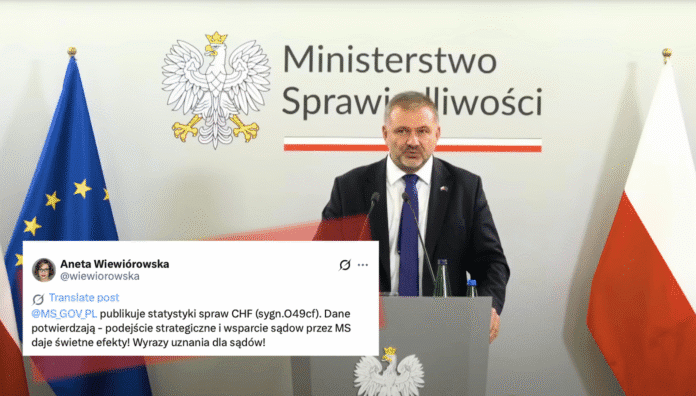 Wizerunkowa porażka Ministerstwa Sprawiedliwości, do której przyczynili się frankowicze (i którą można odtworzyć sobie na YouTube oraz na stronie Sejmu) wymaga rzecz jasna szybkiego zatuszowania. Resort nie może sobie pozwolić na utrwalenie w głowach posłów poglądu, zgodnie z którym rządzący nie mają kontroli nad sprawami frankowymi. Przed kilkoma tygodniami na stronie Ministerstwa Sprawiedliwości pojawiły się najnowsze dane dotyczące spraw 049 cf. W sobotę 18 października przypomniała o nich dr Wiewiórowska-Domagalska, używając do tego platformy X.com. Wpis pełnomocniczki utrzymany jest w optymistycznym tonie, możemy się z niego dowiedzieć, że „Dane potwierdzają – podejście strategiczne i wsparcie sądow przez MS daje świetne efekty!”