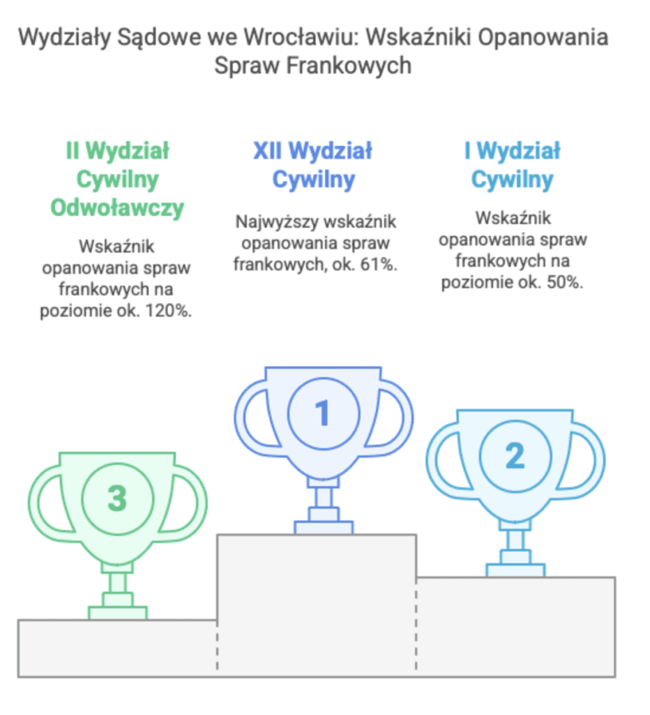 - Sądy Okręgowe we Wrocławiu i Krakowie nie dysponują niestety wyspecjalizowanymi wydziałami frankowymi. Orzeka tam jednak wielu doświadczonych sędziów, doskonale znających specyfikę spraw o symbolu 049 cf, a zatem gotowych wydawać w tych sporach wyroki zgodne z duchem orzeczeń TSUE