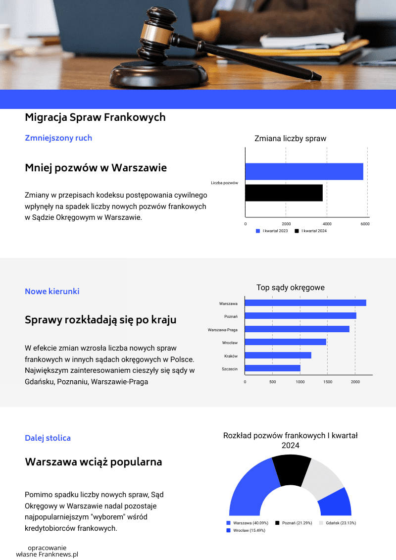 W okresie styczeń – marzec 2024 kredytobiorcy frankowi najczęściej wybierali Sąd Okręgowy w Warszawie (3.818 nowych pozwów), chociaż został on trochę odciążony w wyniku nowelizacji przepisów Kpc (w I kw. 2023 nowych pozwów było tam 5.796). Brak możliwości dalszego składania pozwów do sądów w Warszawie przez kredytobiorców z innych miejscowości spowodował kilkudziesięcioprocentowe wzrosty ilości nowych spraw frankowych w innych sądach w kraju. Po SO w Warszawie największą popularnością wśród Frankowiczów cieszyły się sądy okręgowe w Gdańsku (2.203 nowe pozwy w I kw. 2024), Poznaniu (2.028 nowych pozwów), Warszawa-Praga w Warszawie (1.898 pozwów), we Wrocławiu (1.475 pozwów), w Krakowie (1.206 pozwów) oraz w Szczecinie (1.010 pozwów).