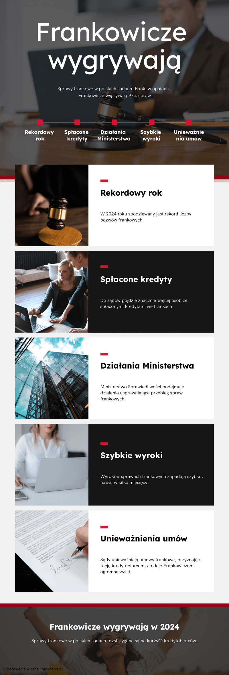 Wydaje się, że rok 2024 to idealny moment na pozwanie banku. Orzecznictwo sądów w sprawach frankowych jest już ugruntowane i prokonsumenckie – w minionym roku Frankowicze wygrali 97% spraw ogółem oraz 99% spraw prawomocnie. Dodatkowo wszystkie wątpliwe kwestie, w tym dotyczące bezpodstawnych roszczeń banków o wynagrodzenie i waloryzację kapitału, zostały rozstrzygnięte na korzyść kredytobiorców.