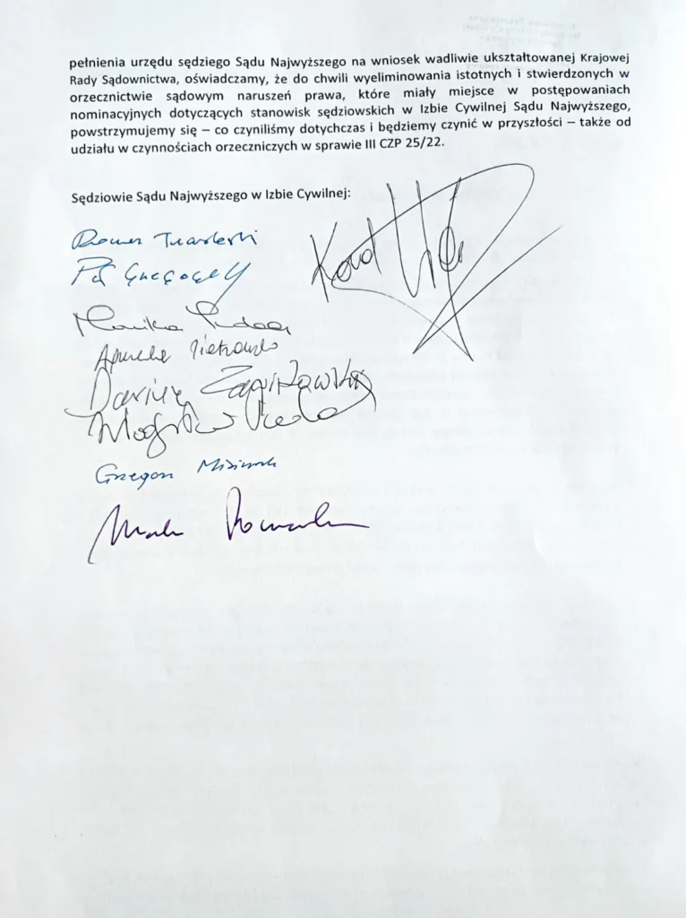 Małgorzata Manowska, Pierwsza Prezes Sądu Najwyższego, wyraziła sprzeciw wobec takich działań, podkreślając, że rozprawy dotyczą rozstrzygania kwestii abstrakcyjnych, gdzie nie występują strony i tylko one mają prawo wnioskować o wyłączenie sędziów. „Obywatele oczekują rozpatrzenia swoich praw, a nie są zainteresowani wewnętrznymi sporami,” stwierdziła Manowska. Tym samym, Izba Cywilna przystąpiła do rozpatrywania postawionych przed nią pytań.