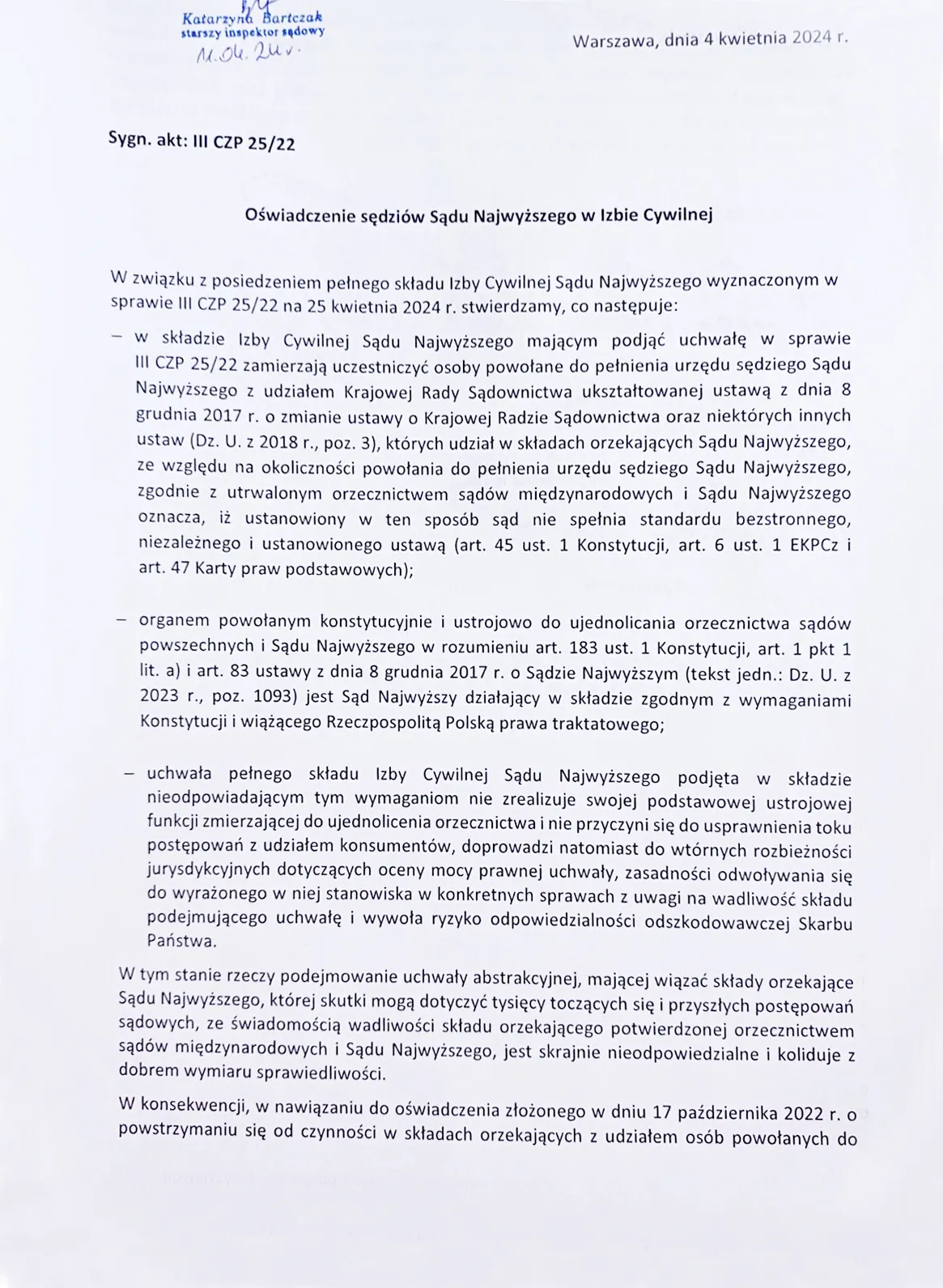 Małgorzata Manowska, Pierwsza Prezes Sądu Najwyższego, wyraziła sprzeciw wobec takich działań, podkreślając, że rozprawy dotyczą rozstrzygania kwestii abstrakcyjnych, gdzie nie występują strony i tylko one mają prawo wnioskować o wyłączenie sędziów. „Obywatele oczekują rozpatrzenia swoich praw, a nie są zainteresowani wewnętrznymi sporami,” stwierdziła Manowska. Tym samym, Izba Cywilna przystąpiła do rozpatrywania postawionych przed nią pytań.