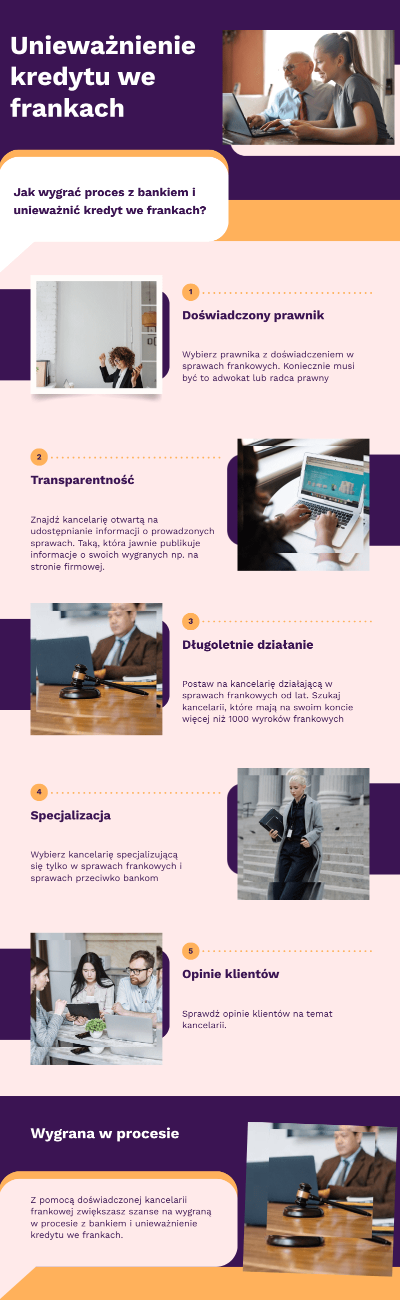 By zapewnić sobie wygraną w procesie z bankiem, najlepiej sprawę taką powierzyć doświadczonej i sprawdzonej kancelarii frankowej, nie można bowiem dać się zwieść, że proces z bankiem to będzie czysta formalność skoro zapada tak wiele korzystnych dla kredytobiorców wyroków. Dobry prawnik to podstawa w postępowaniu o unieważnienie umowy kredytowej.