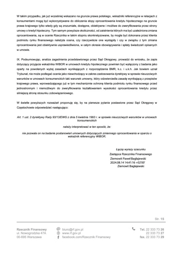 Gdy pierwsza sprawa „wiborowa” wpłynęła do TSUE, rząd polski stanął przed koniecznością sformułowania swojego stanowiska na potrzeby unijnego postępowania. Powołanie w tym okresie nowego Rzecznika Finansowego byłoby ryzykownym krokiem – bo co by było, gdyby miał on podobne podejście do WIBORu, jak poprzednik? Oficjalnie nowy Rzecznik Finansowy został powołany z dniem 1 stycznia 2025 roku. Stanowisko rządu w sprawie WIBORu zostało wysłane do TSUE pod koniec października 2024 roku.