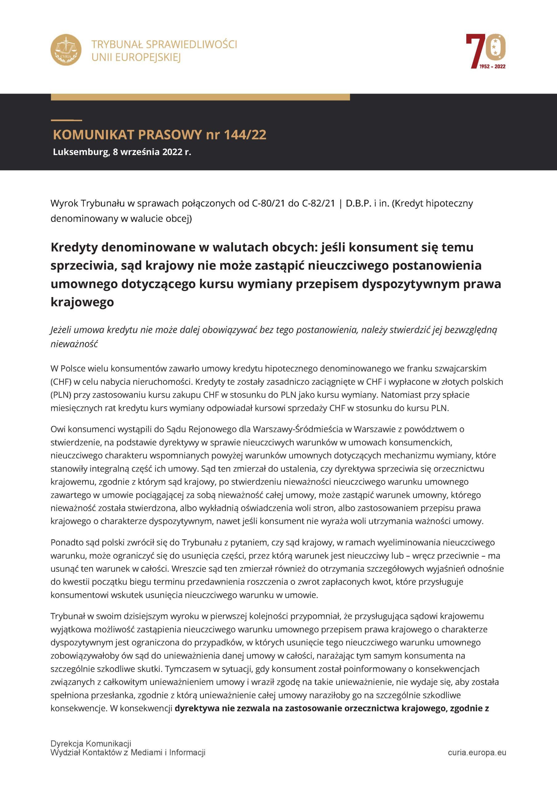 Tym razem TSUE udzielił odpowiedzi na pytania zadane przez Sąd Rejonowy dla Warszawy – Śródmieścia w ramach trzech połączonych spraw C-80/21, C-81/21, C-82/21. W przedmiotowej sprawie oficjalne stanowisko zajął wcześniej polski rząd, który ustosunkował się do wszystkich pytań zadanych TSUE przez warszawski sąd. W każdej z wymienionych kwestii rząd RP opowiedział się za pełną ochroną praw konsumenta i przekazał swoje stanowisko do trybunału w Luksemburgu.