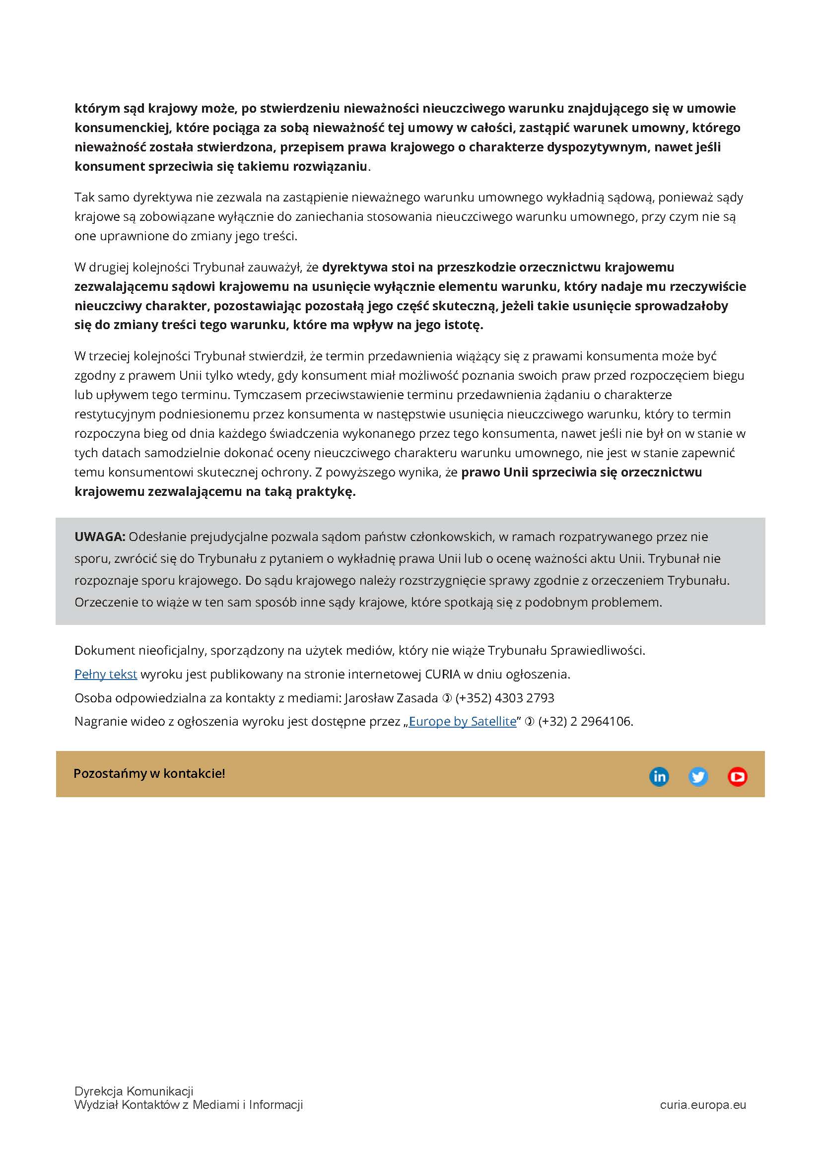 Trybunał w Luksemburgu podkreślił, że krajowe sądy nie są uprawnione do zmiany treści nieuczciwego warunku, ale są zobowiązane do zaniechania jego stosowania. Unijna dyrektywa 93/13 nie zezwala na zastępowanie nieważnego warunku wykładnią sądową.